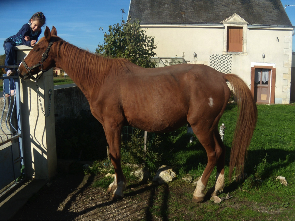 C’est ainsi que nous voilà partis pour 3h de route à travers la Sologne, à la rencontre de Forez, un bel alezan de 22 ans. Son propriétaire me propose de l’essayer : il est doux gentil, je peux facilement le mettre aux 3 allures, et je me sens à l’aise avec lui. Océane alors âgée de 7 ans le monte avec une grande aisance également. L’animal semble bien pour un cheval de cet âge mais il est surtout maigre.